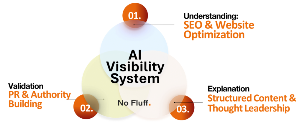 The 64 checkpoints are grouped into four sections: Understanding (SEO & Website Optimization), Validation (PR & Authority), and Explanation (Structured Content & Thought Leadership). Each section reflects a decision layer used by AI systems when assembling an answer. AI does not “rank” as traditional search does. It looks for confidence built from structure, corroboration, and clarity.