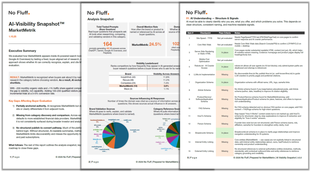 The AI Visibility Snapshot™ is a 14-page executive report that audits your marketing foundation through the lens of AI-driven buyer research. It shows whether your company is included in the moments that shape vendor selection, where competitors are gaining share, and which gaps may be limiting pipeline and revenue growth.
