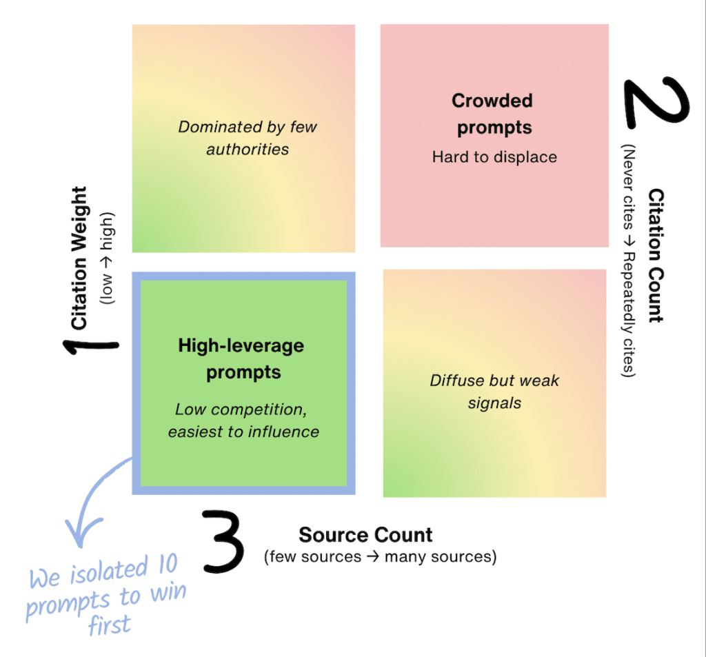 The chart shows how we prioritized AI prompts using three key metrics. This allowed us to find ones with the least competition and the highest chance of influence