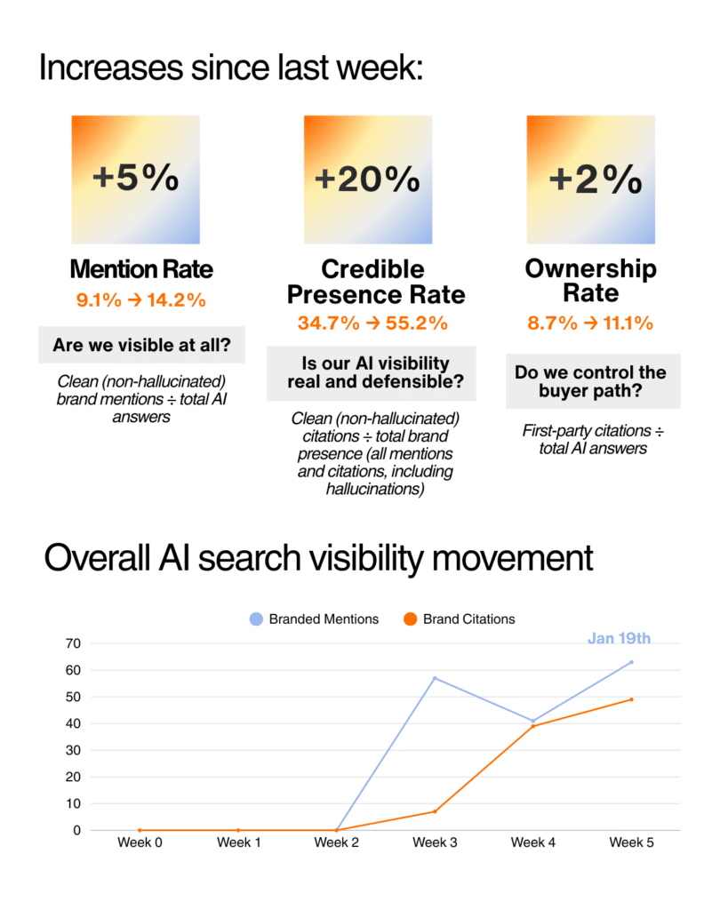 At this stage, the question is no longer whether AI visibility is possible. It’s what actually limits it. This week made one thing very clear: visibility doesn’t stall because of content volume or keyword gaps, it stalls because trust is unfinished. Before we get into the work, a quick note on metrics: