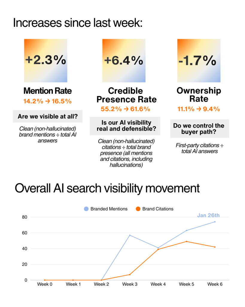 Weekly Performance and Actions, Overall six-week AI visibility movement